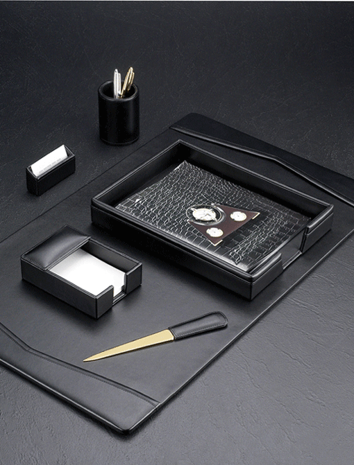 Description: Desk pad collection has a 30" x 18" leather desk pad with stitched and padded side rails. Business card holder. Brass letter opener with leather handle. 4 1/2" x 6 1/2" x 1 3/4" memo box. Letter-size document tray. Pen and pencil cup holder.