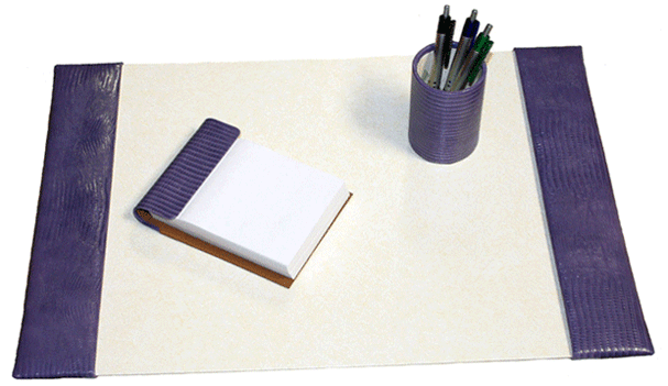 Description : Made of reptile-grain genuine leather. Set includes : 15" x 22" Desk Pad, Pen/Pencil Cup Holder (pens not included) and Notepad. Smooth leatherette surfaces on desk pad, notepad and inside pen/pencil cup.
